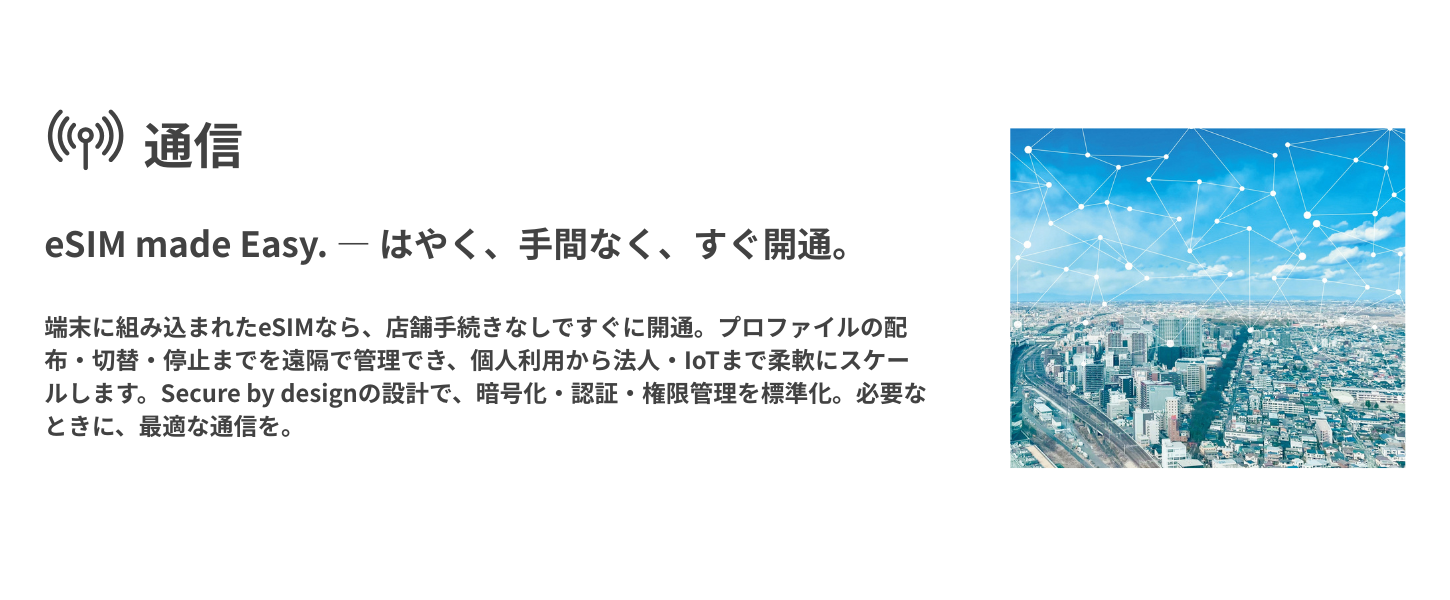 遠隔設定・ファーム更新・アラート運用までを統合し、導入後の運用負荷を大幅に軽減。Secure by designの思想で、通信・端末・プラットフォームを横断して安全性を組み込み、多様な現場の生産性向上とコスト最適化に貢献します。